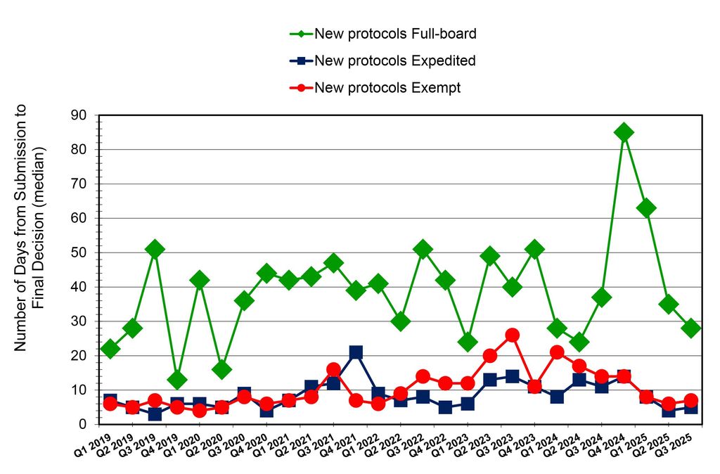 The 75th percentile data, which is how long the IRB takes to finalize the review of 75% of all submissions by type of review are also calculated for each quarter. For the third quarter of 2025 the results are: 33 days for full-board, 12 days for expedited, and 19 days for exempt reviews.