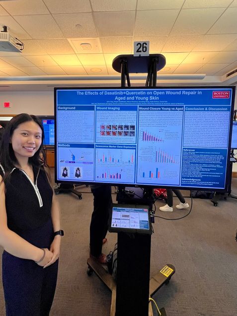 Congratulations to Kylie Tang, a current M2 student, the 2025 Boston University Department of Medicine Research Symposium 3rd place Basic Science Poster Winner! Under the mentorship of Dr. Daniel Roh, MD/PhD, Kylie presented her research project, "The Effects of Dasatinib + Quercetin on Open Wound repair in Aged and Youn Skin." This research project looked at senescence-related cutaneous wound healing and the influence of senolytics on it. They found that senolytics didn’t delay wound healing in young mice, and it significantly accelerated wound healing in aged mice to a comparable rate as young mice. Noting the varying gene expression of different senescence markers at the wound site indicate that there is more to be explored.